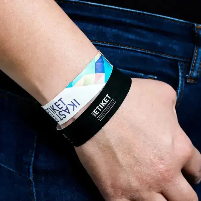paper wristbands with black print. When designing Full Color Tyvek Wristbands, you can easily upload a design you've created in, for example, Illustrator or InDesign. If you haven't yet designed your wristbands, you can also do it online.
